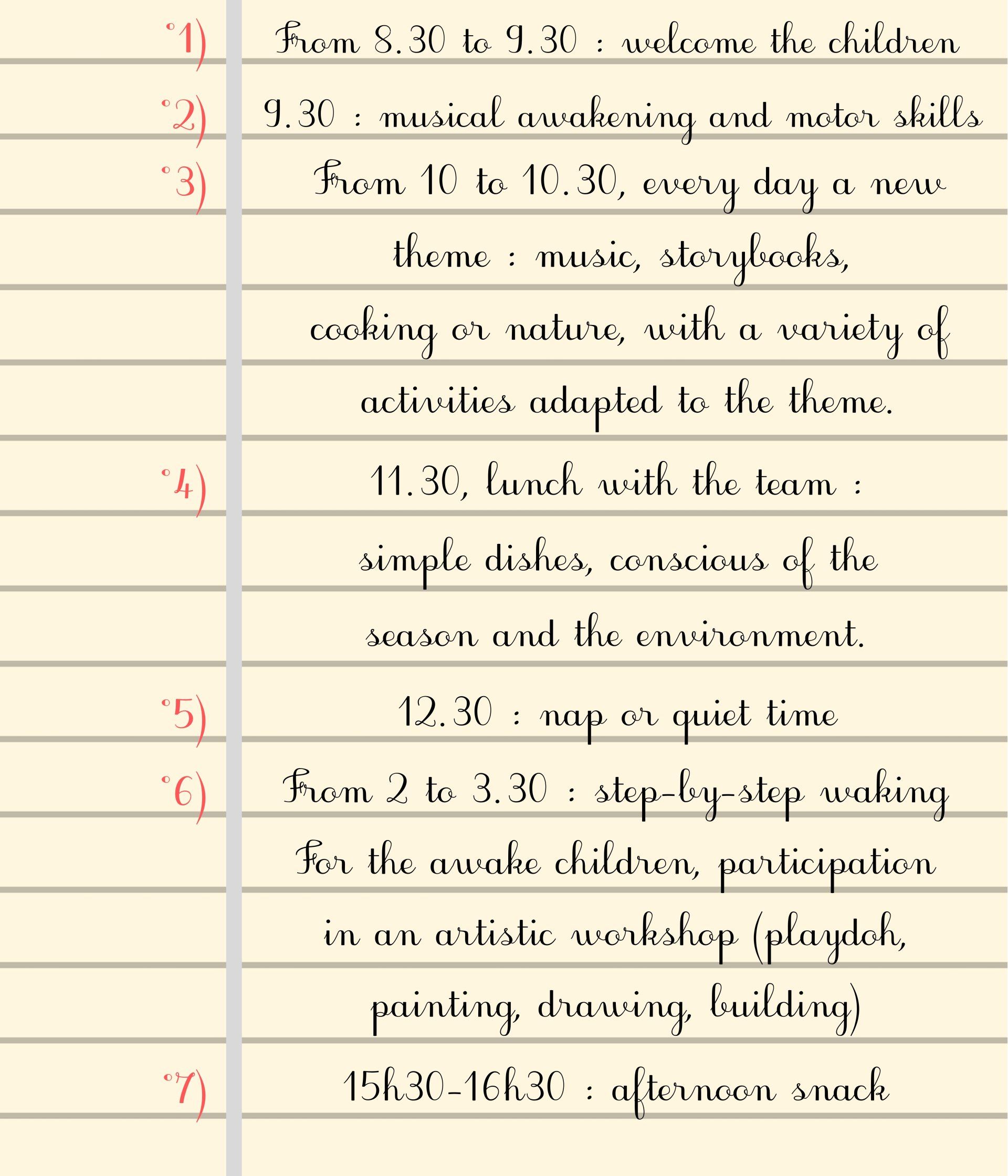 The educational project revolves around the teaching of Les Bons Enfants to support the development of the child in all its dimensions: emotional, physical and intellectual. The introduction to English, music, nature, but also essential foundations such as the development of motor skills or emotional security are the pillars of our approach.